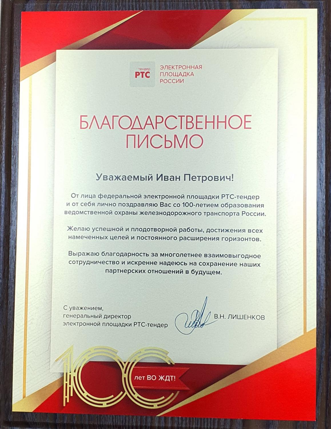 Благодарность РТС-тендер